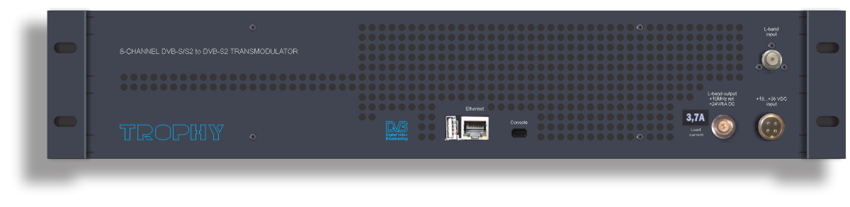 The device is 8-CHANNEL 2U/19” BOX for DVB-S/S2 to DVB-S2 TRANSMODULATORS. The output signal are provided via RF-output and configurable by WEB interface. The signal can be broadcast into MVDS network. Using the integrated WEB-interface the operating parameters can be varied within wide limits.
