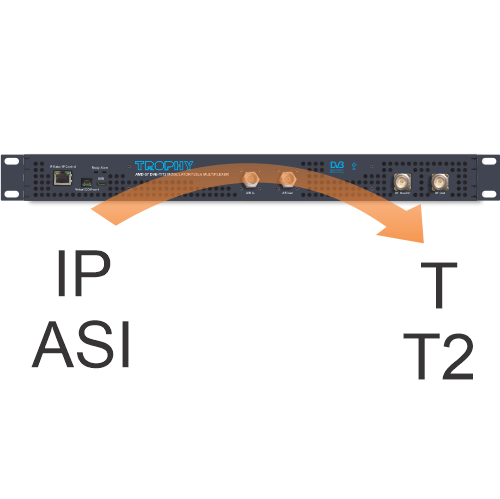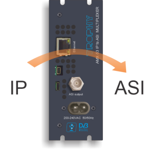 The device receives a data stream via Gigabit Ethernet or ASI. It can receive up to 120 transport streams from the TROPHY Head End or from another IP sources included MPEG transport streams.
