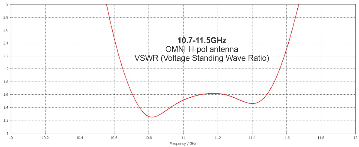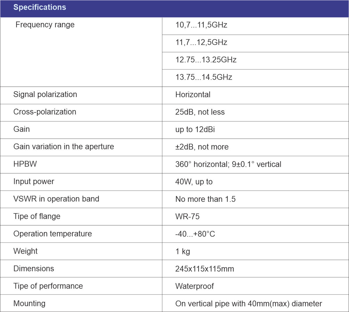 PROFI series slotted omnidirectional antenna is used like the transmitting H-polarization outdoor antenna for terrestrial Ku-band broadcasting. Antenna aperture is: 360° Azimuth Beam; 9° Elevation Beam. Antenna is a slotted twenty-element array implemented on a 19×9.5mm waveguide made of galvanized brass. Antenna has a circular directivity pattern. Radio-transparent shelter is made of fiberglass material using polyester binders. The outer surface of the shelter is covered with a gelcoat to protect against ultraviolet radiation from the sun as well as to prevent icing. Connecting unit is 19×9.5mm flange waveguide. Antenna service life is more than 15 years.